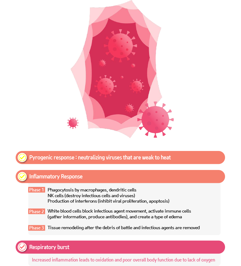 Wenn ein Antigen eindringt, reagiert der menschliche Körper zunächst mit einer Erhöhung seiner Temperatur, um temperaturempfindliche Viren abzutöten. Wird das Virus nicht zerstört, manifestiert sich die Immunreaktion in einer Entzündung. Die Entzündungsreaktion erfolgt in drei Phasen: Erste Phase: Makrophagen verschlingen das Virus, während NK-Zellen (natürliche Killerzellen) die virusinfizierten Zellen eliminieren, indem sie Interferon produzieren, um das Viruswachstum zu hemmen und die Apoptose einzuleiten. Zweite Phase: Weiße Blutkörperchen blockieren die Bewegung infizierter Zellen oder produzieren Antikörper, wodurch es zu einem Kampf zwischen dem Virus und den Antikörpern kommt. Dritte Phase: Die Überbleibsel des Kampfes werden entfernt und Gewebe regeneriert. Die während dieser Immunreaktion entstehende Entzündung kann jedoch aufgrund von Oxidation und Sauerstoffmangel die allgemeine körperliche Funktion beeinträchtigen und sich letzten Endes negativ auf unsere Gesundheit auswirken.