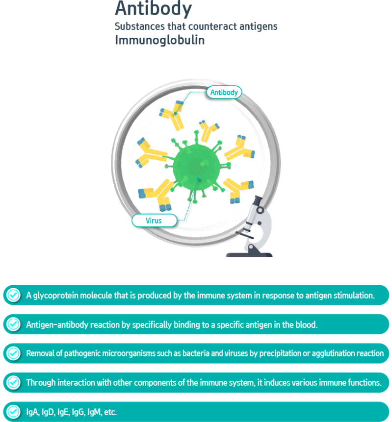 Ein Antikörper erkennt ein Antigen und bildet mit ihm einen Antigen-Antikörper-Komplex, um es zu neutralisieren. Immunglobulin (Ig) ist ein spezifischer Antikörper der erworbenen Immunität – ein Glykoprotein, das als Reaktion auf die Stimulation durch Antigene produziert wird und eine Immunreaktion auslöst.